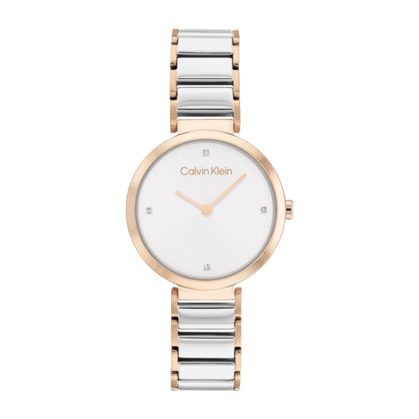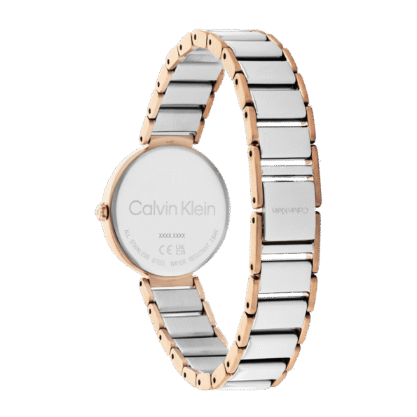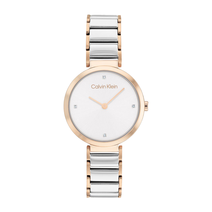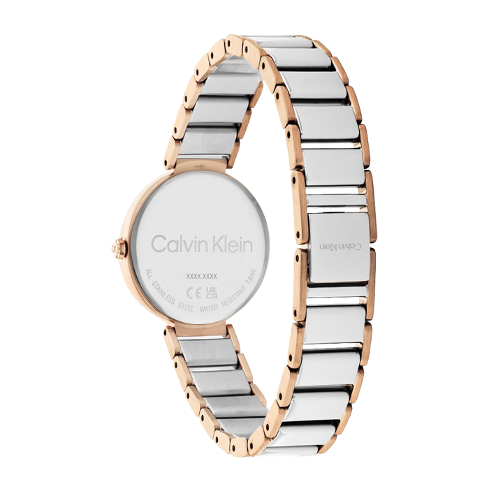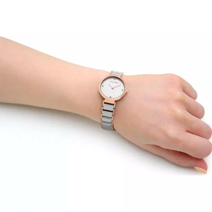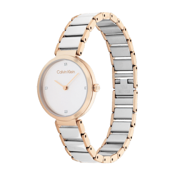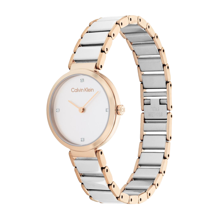 Циферблат украшен часовой и минутной стрелками из цвета розового золота, а также четырьмя индексами из хрусталя. Минеральное стекло защищает циферблат. корпус из нержавеющей стали с покрытием из розового золота обрамляет циферблат. Часы дополнены двухцветным браслетом из розового золота и нержавеющей стали. застегивается на ювелирную застежку. часы оснащены кварцевым механизмом. эти часы защищены от брызг и не должны погружаться в воду.