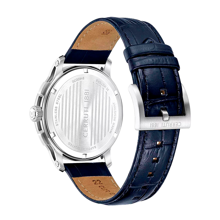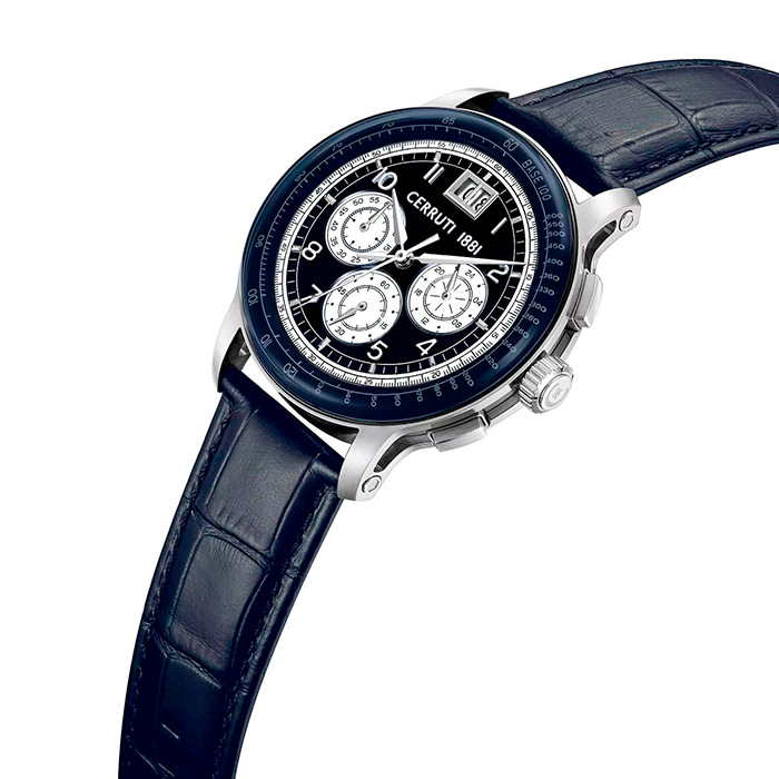 Cerruti 1881 Petroio Chronograph CIWGC0084603 — мужские часы с функцией хронографа, сочетающие спортивный стиль и элегантную отделку. Серебристый корпус из нержавеющей стали сочетается с чёрным циферблатом и синим кожаным ремешком. Модель оснащена минеральным стеклом с сапфировым покрытием и кварцевым механизмом. Водонепроницаемость до 50 метров делает часы влагозащищёнными.