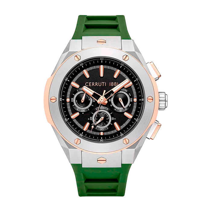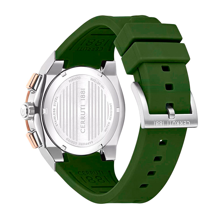 Мужские часы Cerruti 1881 Ruscello CIWGQ0085603 оснащены кварцевым механизмом. Корпус диаметром 44 мм выполнен из нержавеющей стали серебристого цвета с элементами из розового золота, что придаёт часам интересный двухцветный вид. Чёрный циферблат покрыт минеральным стеклом с сапфировым напылением. Ремешок из зелёного силикона обеспечивает комфорт при ношении и плотно облегает запястье. Водонепроницаемость модели составляет до 50 метров, что защищает её от брызг.