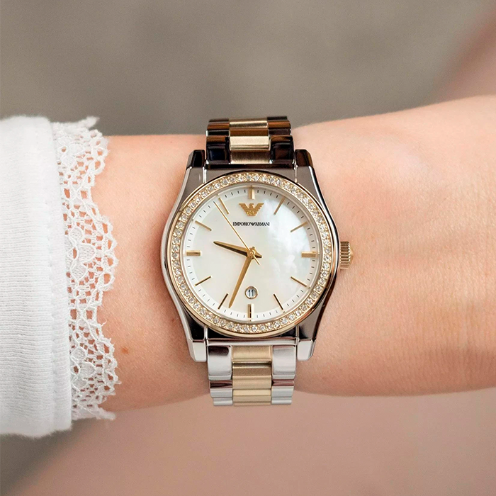 Federica. Женские часы в круглом стальном корпусе. Перламутровый циферблат с метками в виде штрихов. Окошко даты находится в положении 6 часов. Безель украшен кристаллами. Стальной браслет с раскладывающейся застежкой.