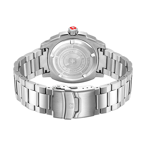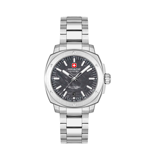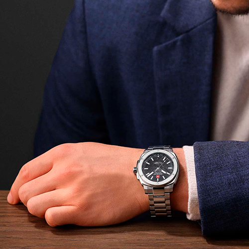 Накладные метки в виде штрихов. Окошко даты находится на отметке 6 часов. Рифленая заводная головка с защитой. Надежный стальной браслет с раскладывающейся застежкой.