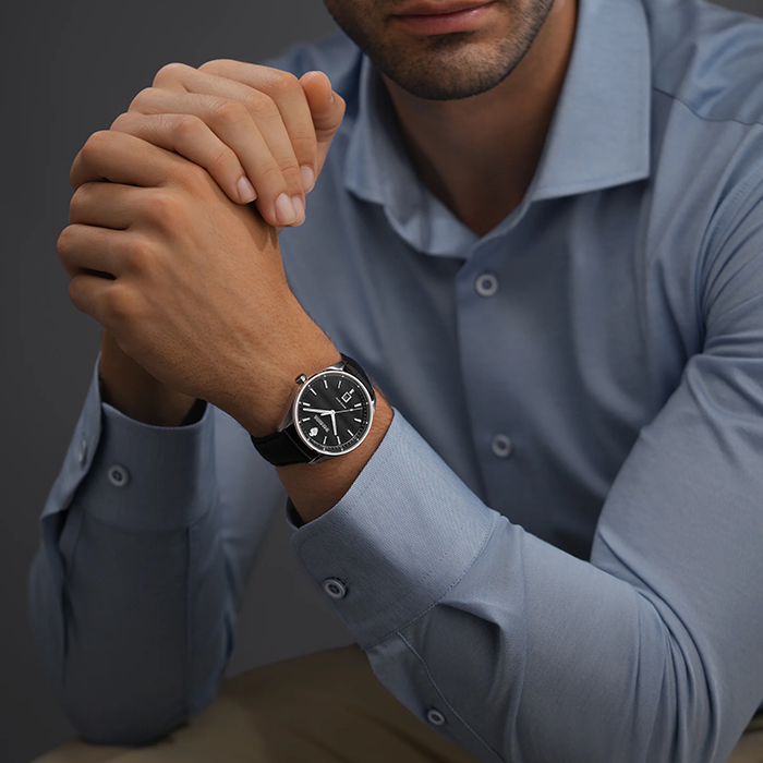 Современный, но в то же время сдержанно вневременной дизайн – это воплощение чистоты и совершенства. Корпус диаметром 40,5 мм обрамляет черный циферблат с тонкой отделкой Côtes de Genève под сапфировым стеклом, где серебристые стрелки, слегка светящиеся, плавно скользят. Сдержанное окошко даты в положении «6 часов» подчеркивает изысканную симметрию, а знак Swiss Made подтверждает высочайшее качество часового производства.