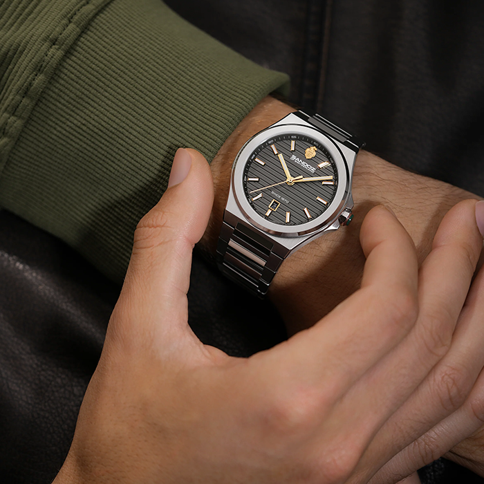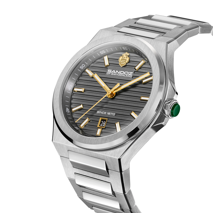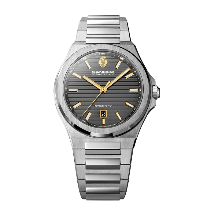 Это отражение традиций точности и тщательности, которые определяют швейцарское часовое производство. Антрацитовый циферблат с узором одновременно сдержан и изыскан, а индексы из желтого золота и светящиеся стрелки обеспечивают четкость с первого взгляда. Кварцевый механизм гарантирует надежную точность хода, а окошко даты добавляет функциональности в повседневном использовании. Корпус и браслет из нержавеющей стали образуют чистый, современный силуэт — сбалансированный, удобный и долговечный.