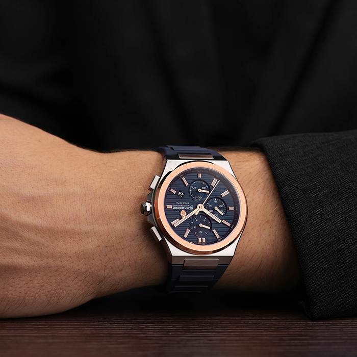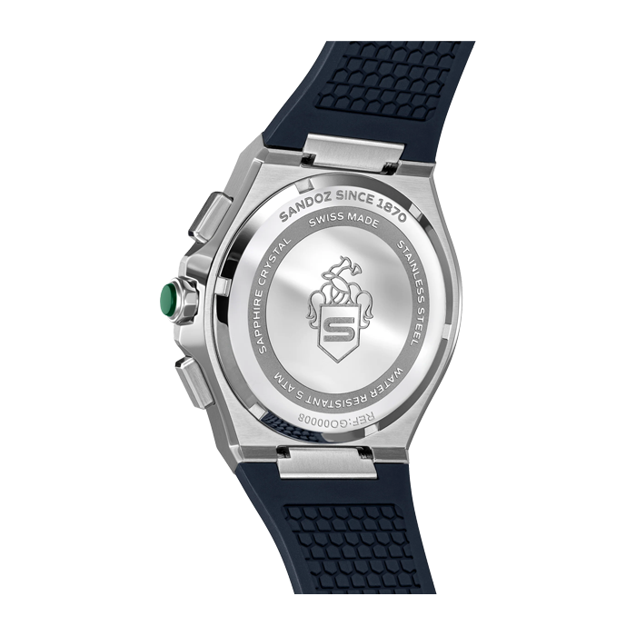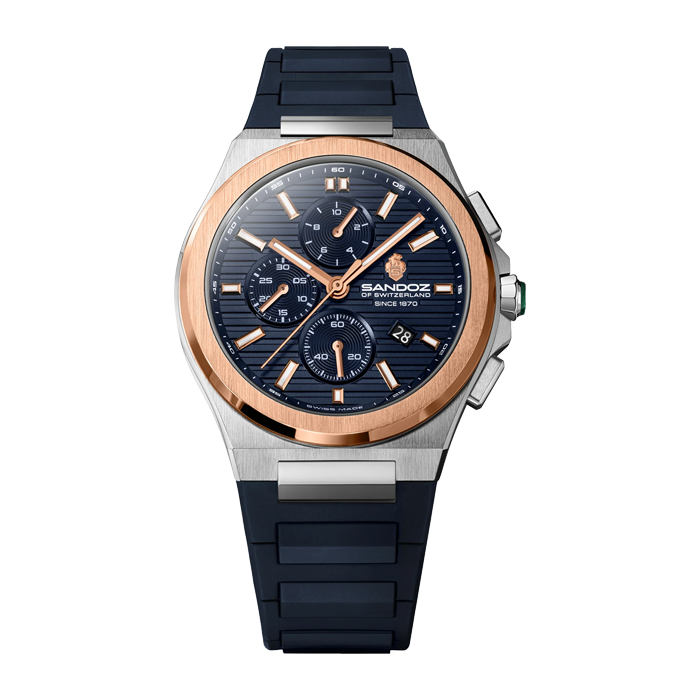 Синий циферблат с узором продуман до мелочей: три дополнительных циферблата расположены в идеальной симметрии. Светящиеся метки из розового золота улучшают читаемость при любом освещении, а прочный синий ремешок добавляет современный, приятный на ощупь контраст. Сочетая современную эстетику с вневременной функциональностью, эти часы безошибочно узнаваемы как Sandoz.