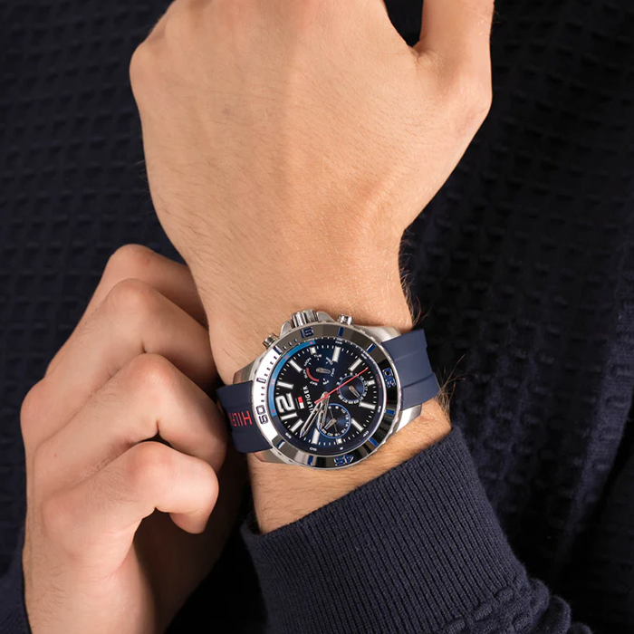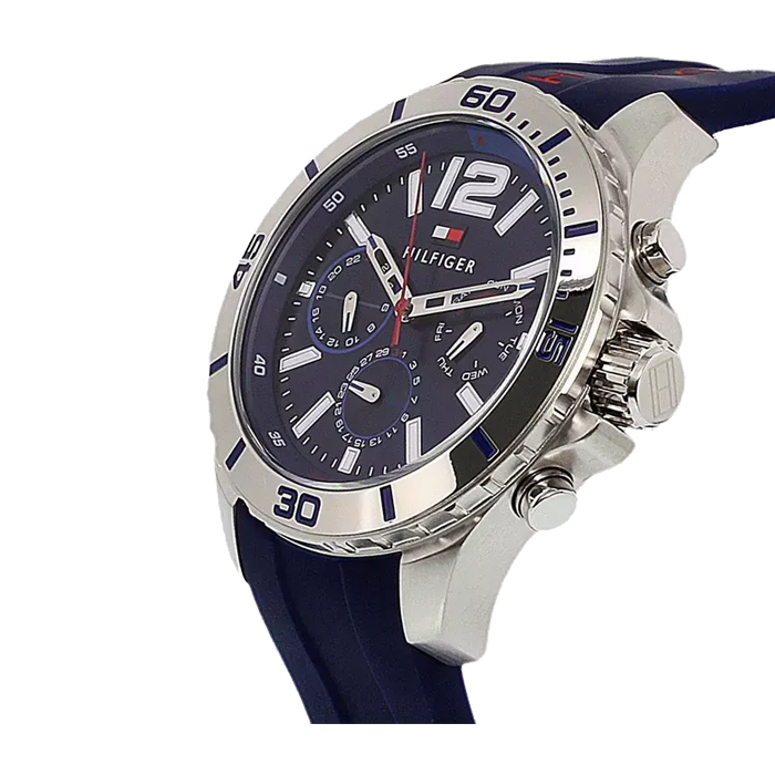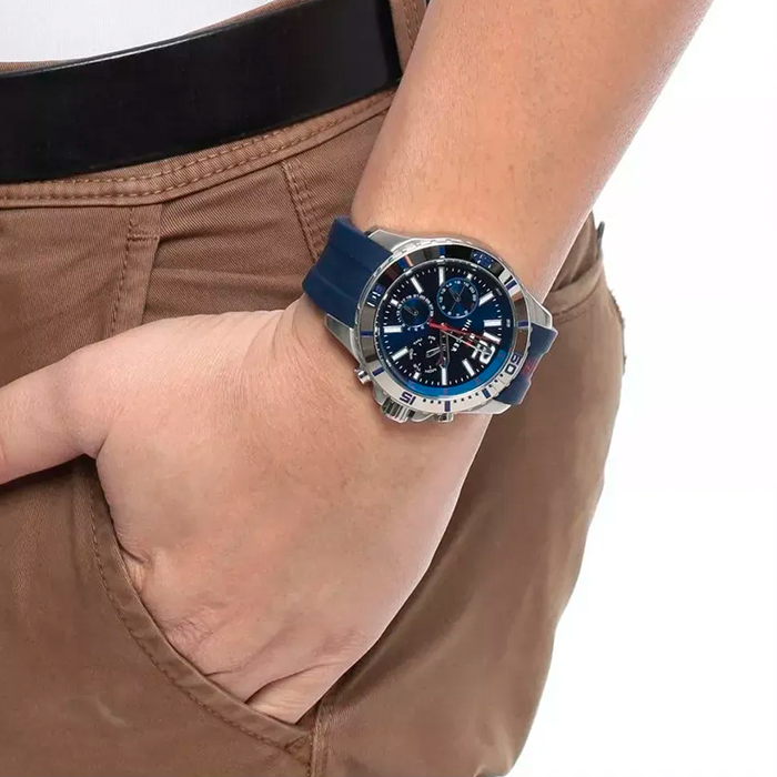 Синий циферблат. Светящиеся стрелки и индексы из нержавеющей стали. Указатель дня недели на отметке «9». Указатель даты на отметке «6».
